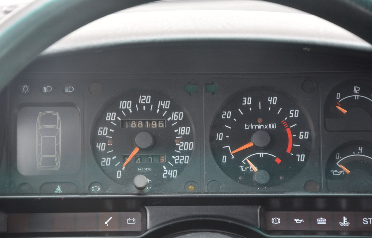 La planche de bord a conservé tout son aspect d'origine sans craquelures tout comme les commandes dites "satellites". Le volant monobranche siglé "Turbo" est lui aussi très bien conservé.